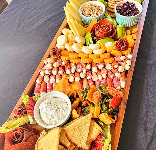 *Charcuterie Tray – imported and domestic gourmet cheeses, summer sausage, nuts, fruits, vegetables, grapes, jam, salami, pepperoni, hummus, with sourdough toast points, bagel chips and cracker selection.