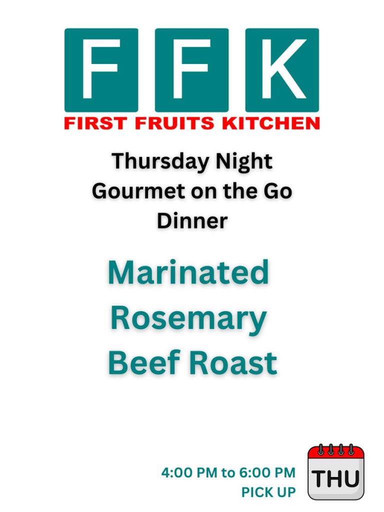 September 4, 2024Published by admin on September 4, 2024Categories Drop Off Catering Wedding Cakes and Drop-Off CateringMarinated Rosemary Beef RoastOur “signature” rosemary beef roast is very popular here at First Fruits Kitchen. This Thursday the meal is : Rosemary Beef Roast– a marinated then slow […]